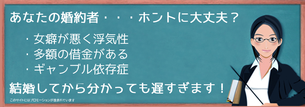 調査の素人であるアナタが調べても尻尾は出さないでしょうし、調査を察知されると水面下に潜ってしまいます。そうなるとプロの興信所や探偵社が調べようとしても、なかなか結果が出ないものです。結婚の話が出たらすぐに第三者の調査機関に事実を証明してもらうのが一番なんです。